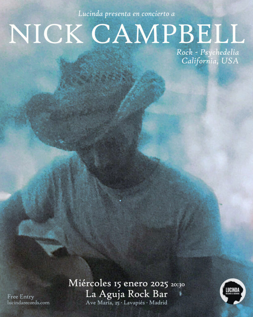 Nick Campbell es un músico californiano nacido y criado en Carmel-by-the-Sea. Escritor y multi-instrumentista, encontró su sonido entre la niebla de Haight Ashbury en San Francisco. Con raíces en el teatro musical y la música surf, cuenta historias de amor y viajes con un estilo personal repleto de imágenes oníricas y sonidos psicodélicos. Ha actuado durante años por todo EE.UU, en solitario y con bandas como Shalants, Flagpoles, My Revolver, Montra, Tres Palmas y Boots on the Ground. Nick Campbell actúa por primera vez en Madrid el 15 de enero de 2025 en La Aguja de Lavapiés a partir de las 20:30. Entrada libre.