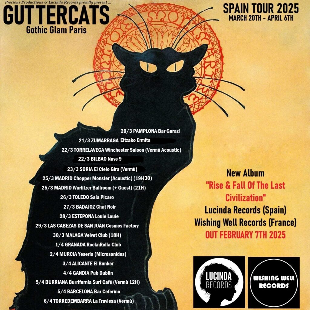 Guttercats -legendaria banda formada en Paris en 2007- lanzan su sexto álbum de estudio ‘Rise & Fall of the Last Civilization’ (Lucinda Records, 2025) el 21 de febrero y estarán de gira por nuestro país del 20 de marzo al 6 de abril. Con una trayectoria intachable, Guttercats se han convertido en los mejores herederos de Only Ones, Dogs D’Amour, Flamin Groovies, Barracudas y Roky Erikson. Reserva AQUÍ tu ejemplar en vinilo 12 pulgadas, edición limitada de 300 copias.
