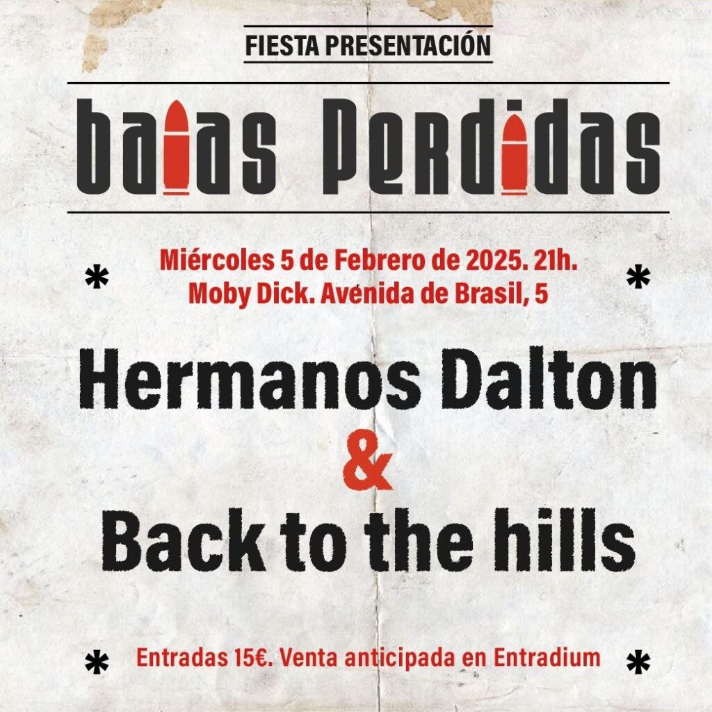 En activo desde los 90 y con una legión de fans entregados, Los Hermanos Dalton acaban de publicar ‘Viajar en el Tiempo y otras historias’ (Rock Indiana / Hurrah Música, 2024), fantástico álbum propio de unos auténticos clásicos del Power Pop español. Buenos aprendices son los castellonense Back to de Hills, con cierto aire a rock americano y dos fabulosos discos a sus espaldas, que abrirán el concierto en Moby Dick Club el próximo 5 de febrero en la Presentación de Balas Perdidas, el boletín semanal de hoyesarte.com para gourmets del Rock and Roll, que dirige Pablo Carrero. Las localidades para tan señalado acontecimiento están a la venta en Entradium