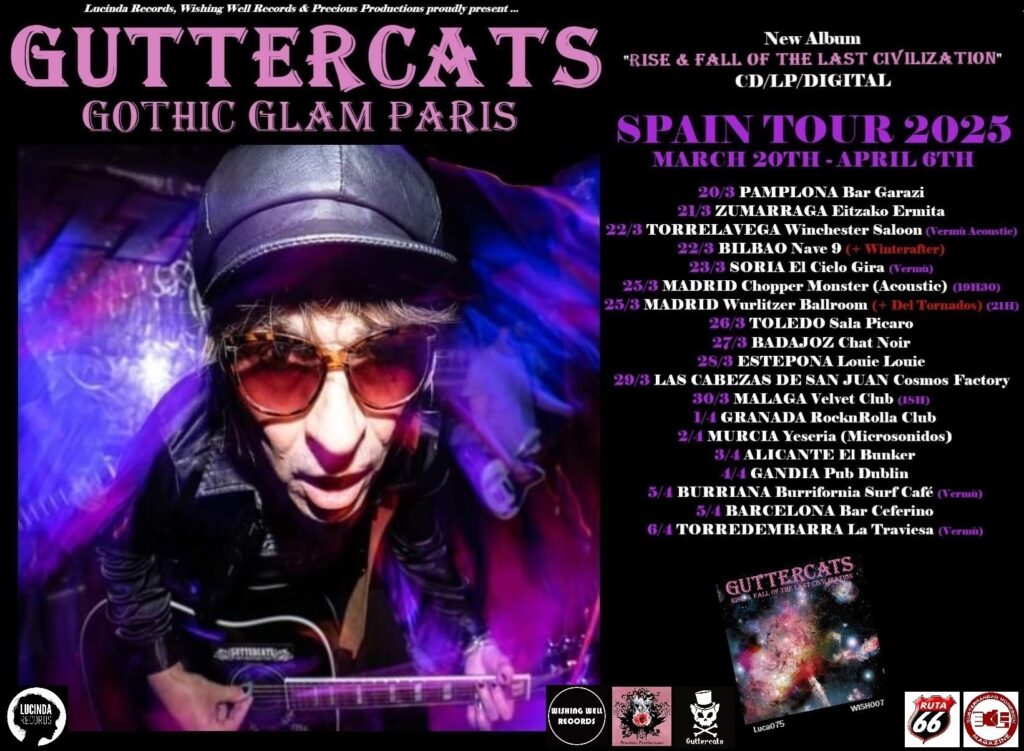 Guttercats -legendaria banda formada en Paris en 2007- están de gira por nuestro país del 20 de marzo al 6 de abril presentando las canciones de su sexto álbum de estudio ‘Rise & Fall of the Last Civilization’ (Lucinda/ Wishing Well, 2025). Con una trayectoria intachable, Guttercats se han convertido en los mejores herederos de Only Ones, Dogs D’Amour, Barracudas y Flamin Groovies.